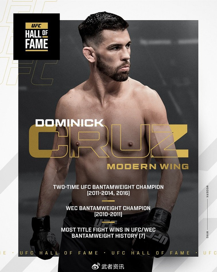 武者网讯 在UFC 324比赛当天,UFC宣布前UFC和WEC雏量级冠军多米尼克·克鲁兹(Dominick Cruz)作为2026年“当代之翼”入选UFC名人堂,2026年UFC名人堂颁奖典礼将于今年夏天举行。