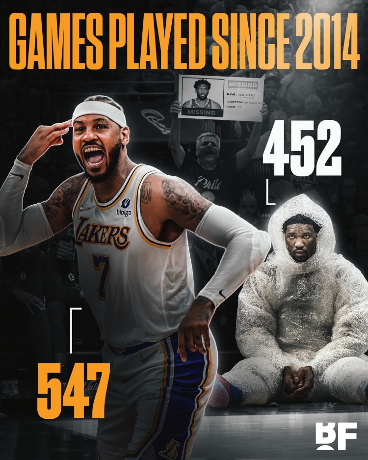 自2014年恩比德加入NBA以来,安东尼累计参赛547场,而恩比德出场数为452场。需要特别说明的是,安东尼已于2023年正式结束职业生涯。